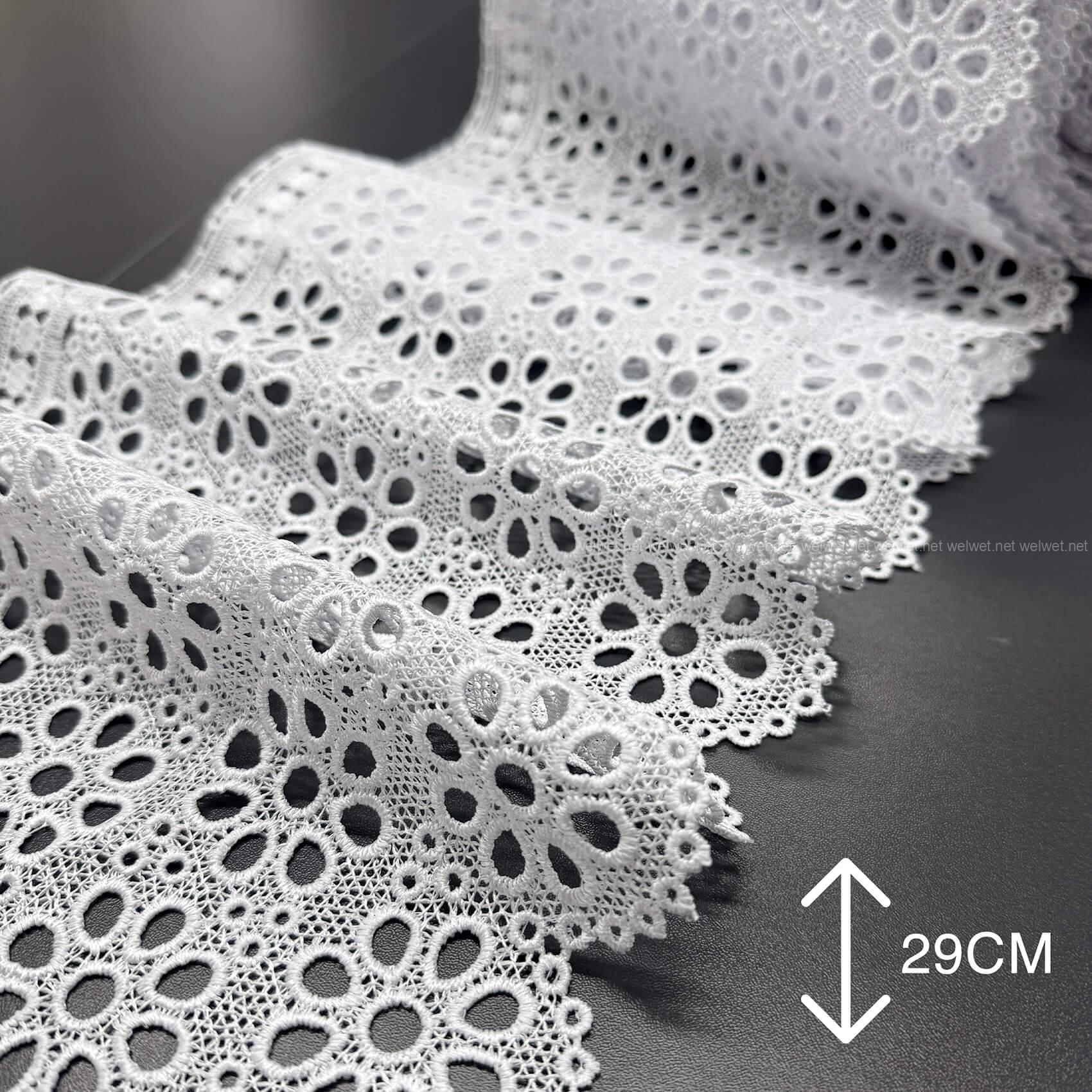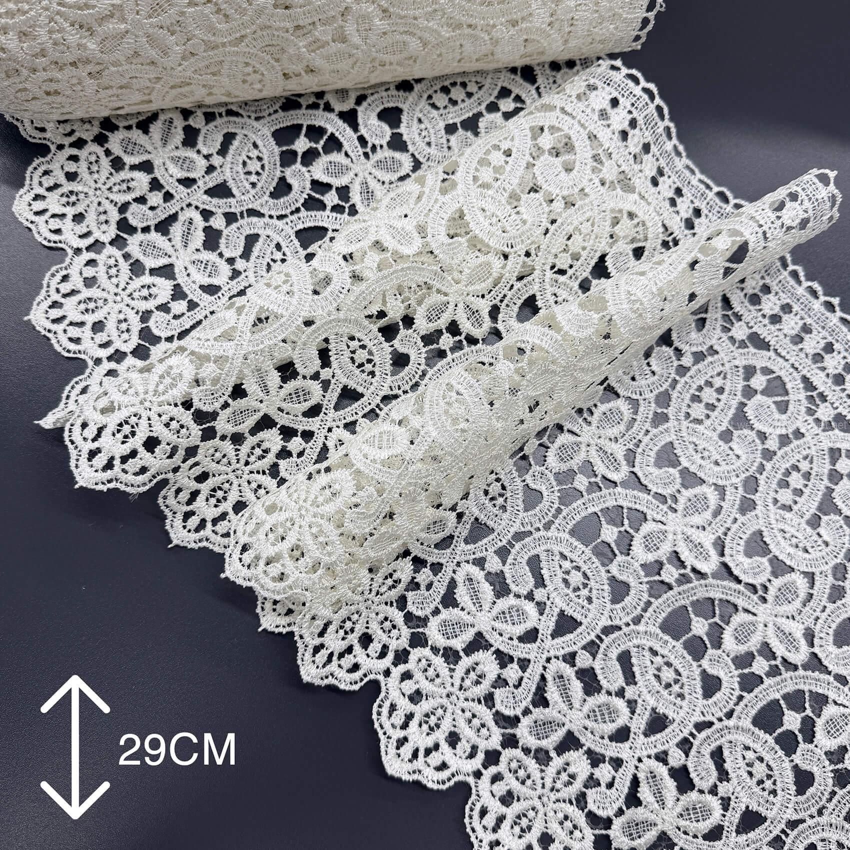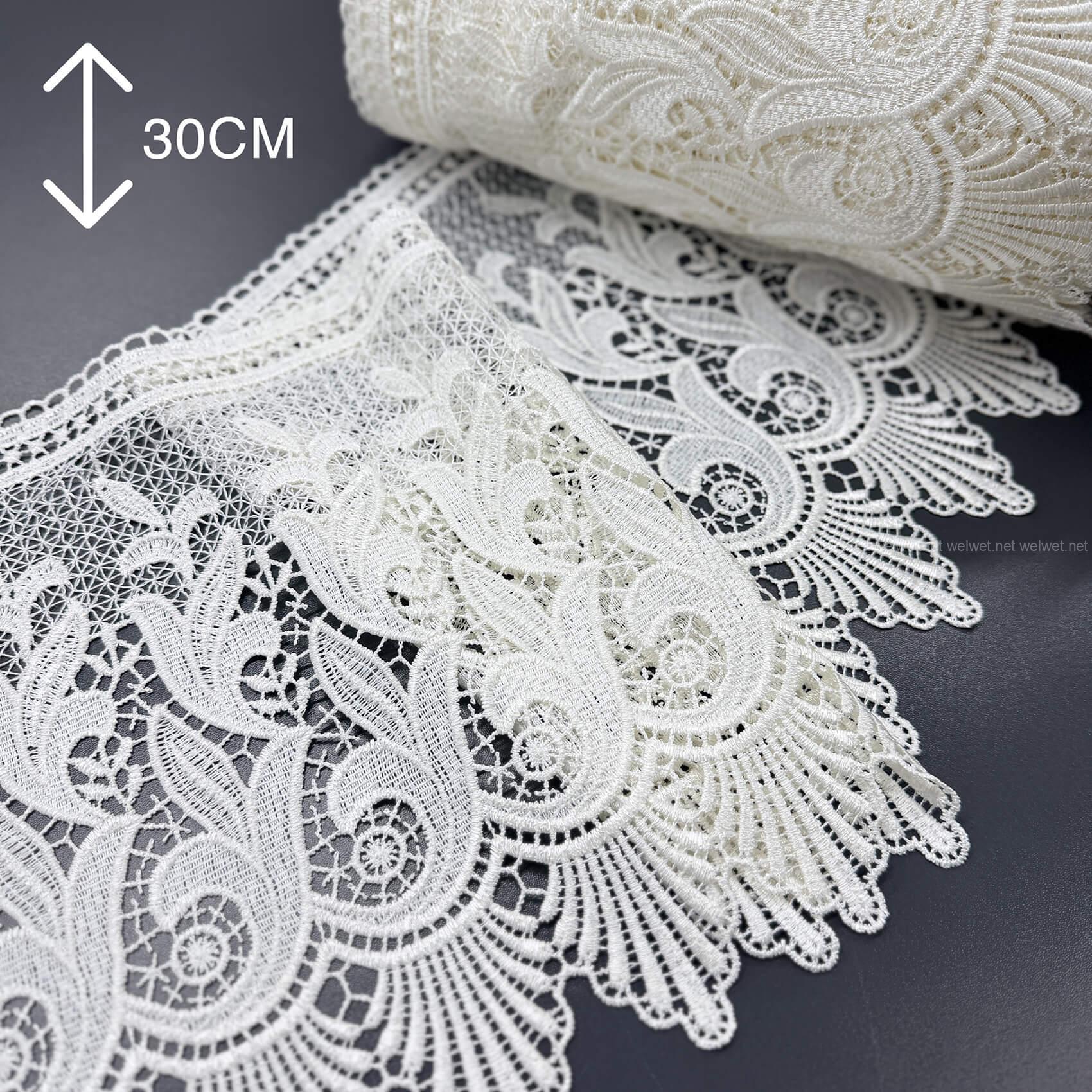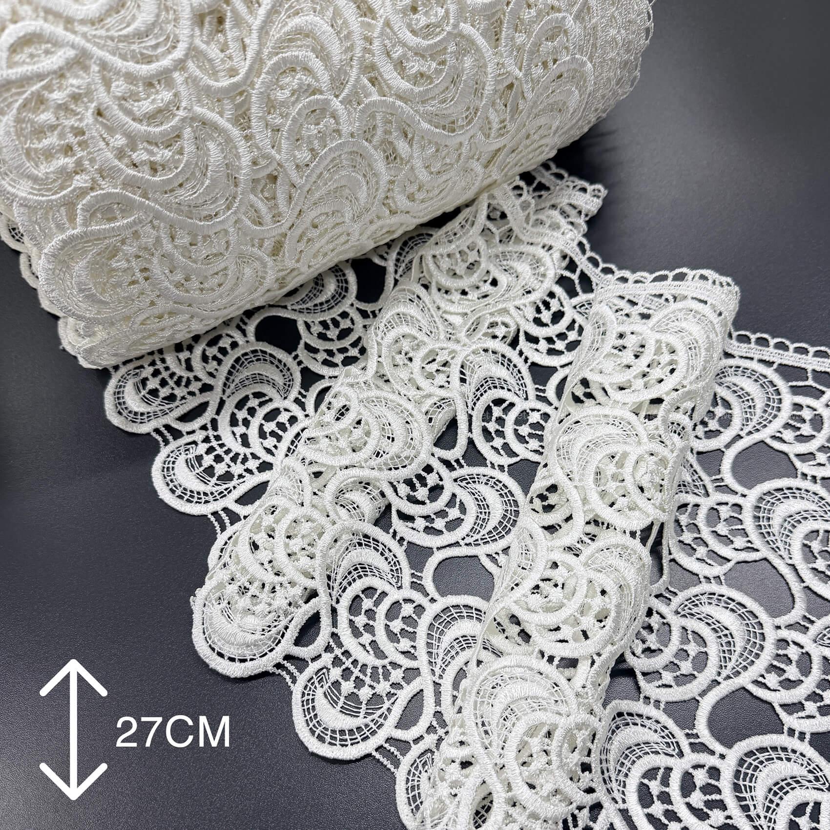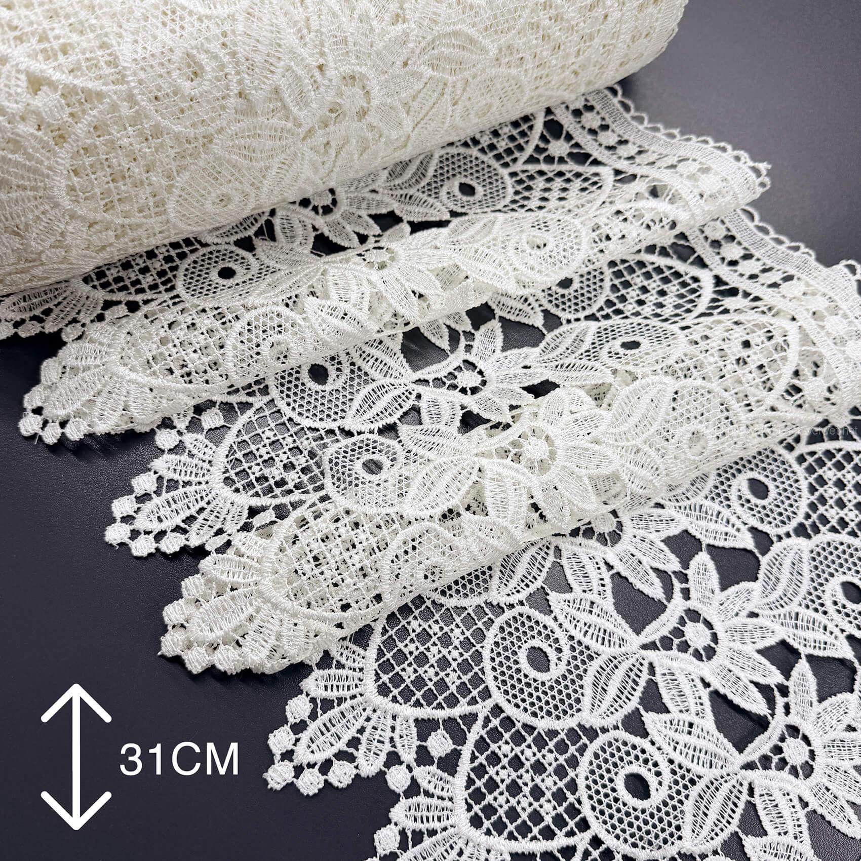 Широке мереживо (від 10 до 31 см) найчастіше купують для оздоблення низу штор або тюлю. Воно добре тримає форму, створює красивий акцент, візуально подовжує вікно. Особливо гарно виглядає на легких тканинах — вуаль, органза, батист. Ціна залежить від складності візерунка та матеріалу, в середньому від 150 до 250 грн за метр.