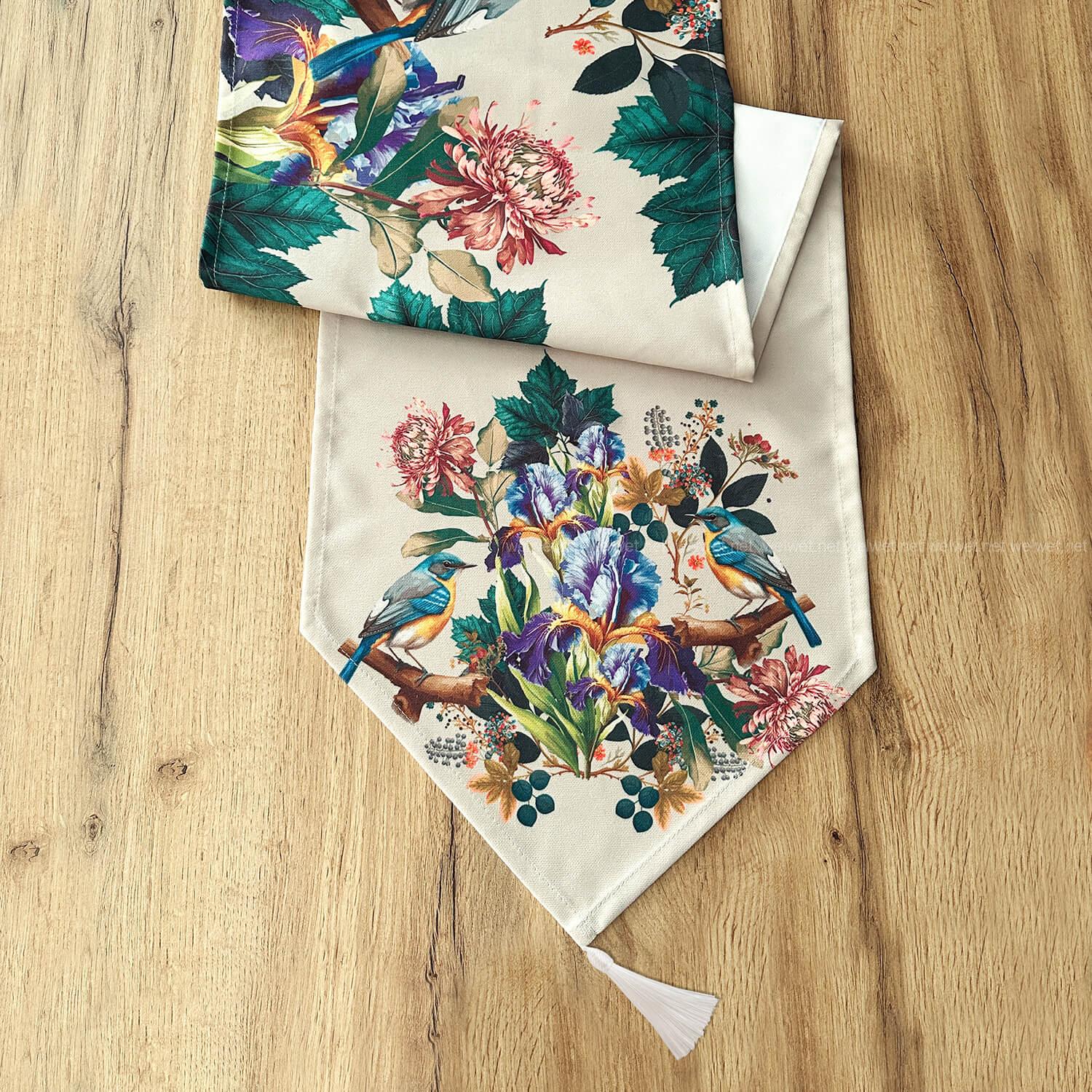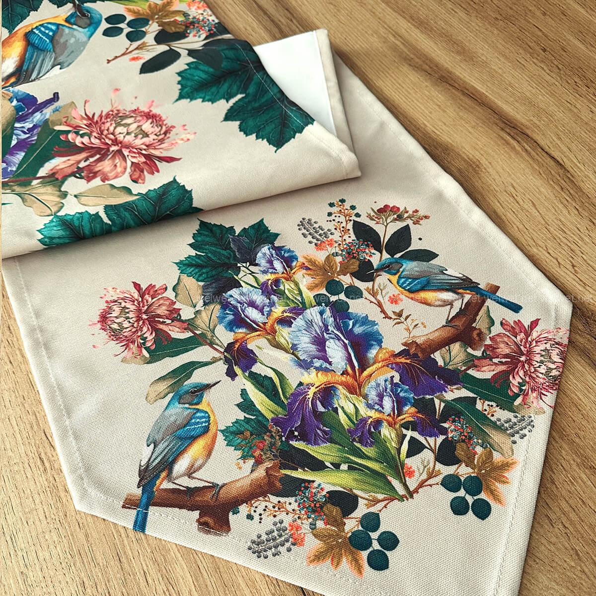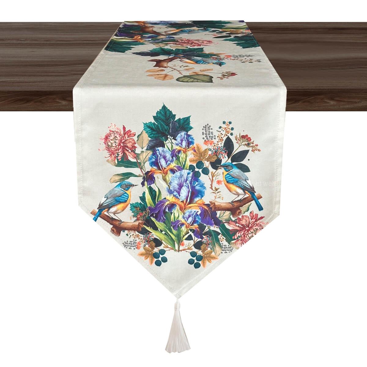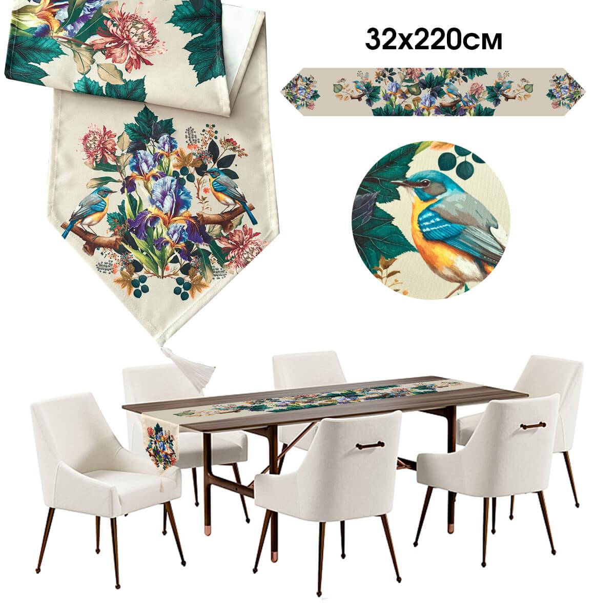 Дана вузька скатертина з сучасним квітковим малюнком та птахами стане чудовим акцентом Вашого інтер’єру. Ранер з принтом на кухонний стіл - це не лише стильно, але й практично. Він захистить стіл від подряпин і плям, а також створить святкову атмосферу.