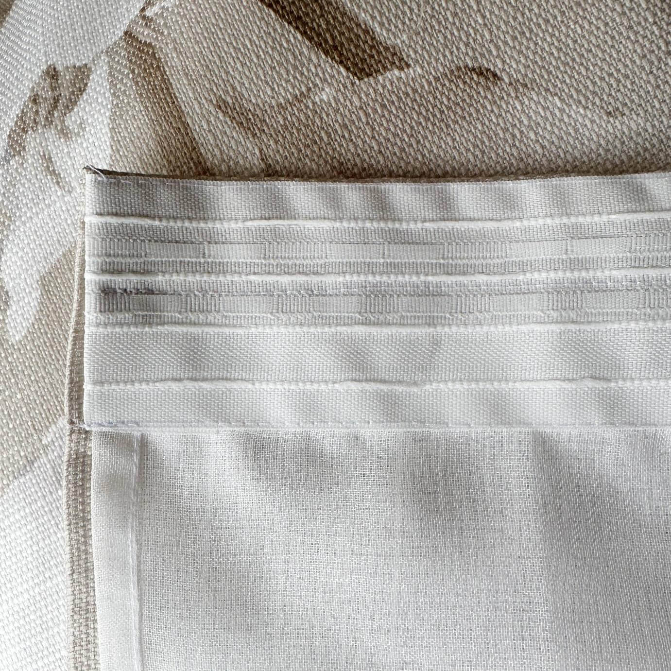 Размер занавески — 2,8 м в ширину и 1,6 м в высоту. Верх оформлен на тесьму со сборкой «вафелька» для удобного монтажа.