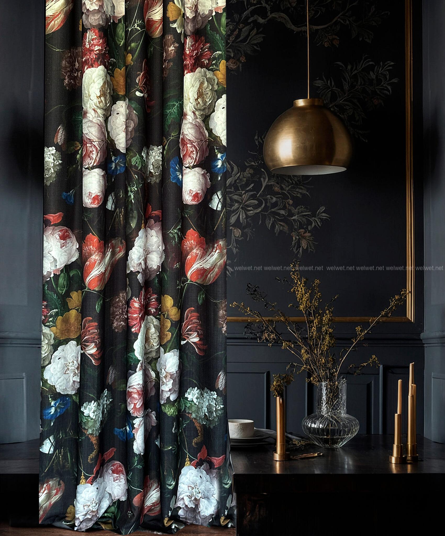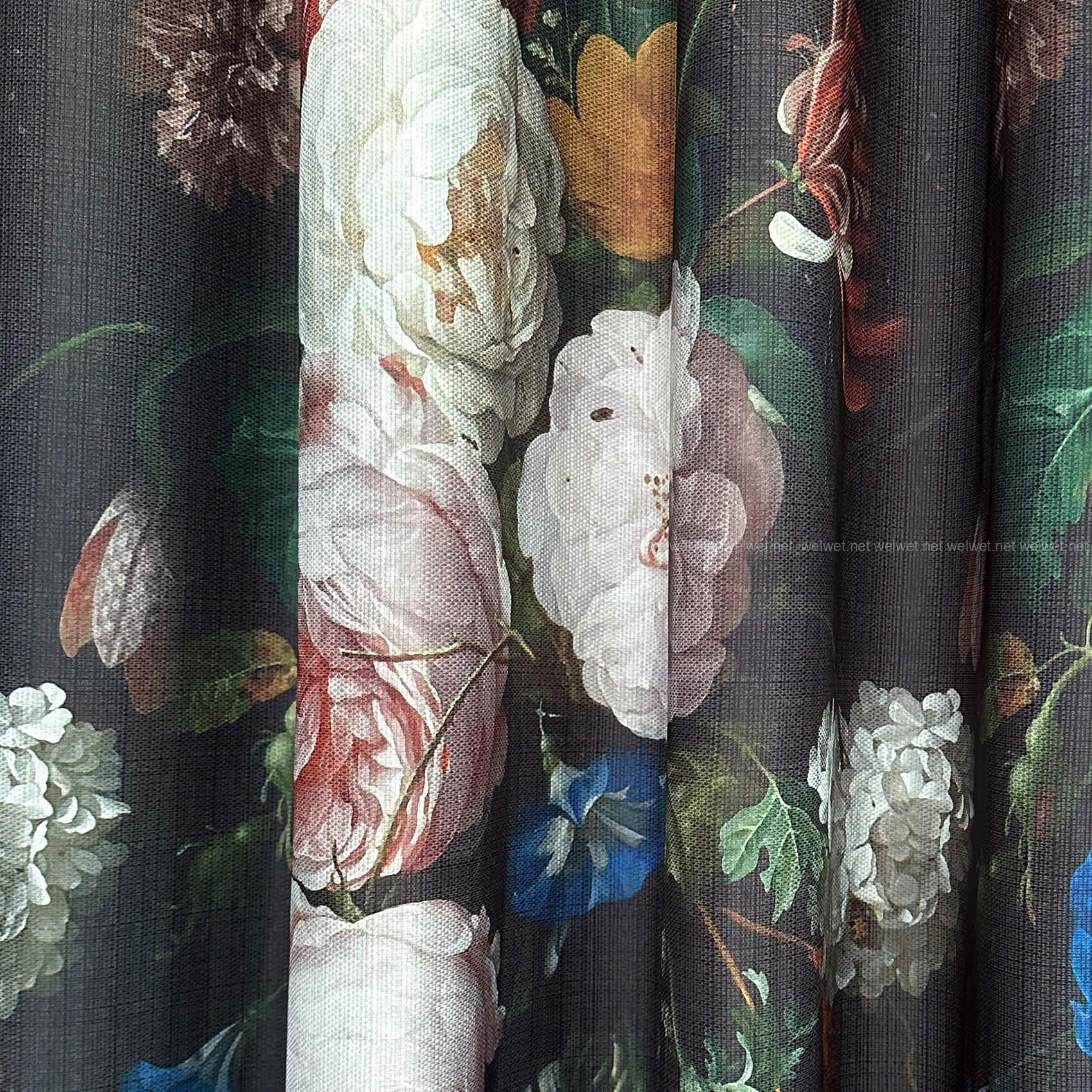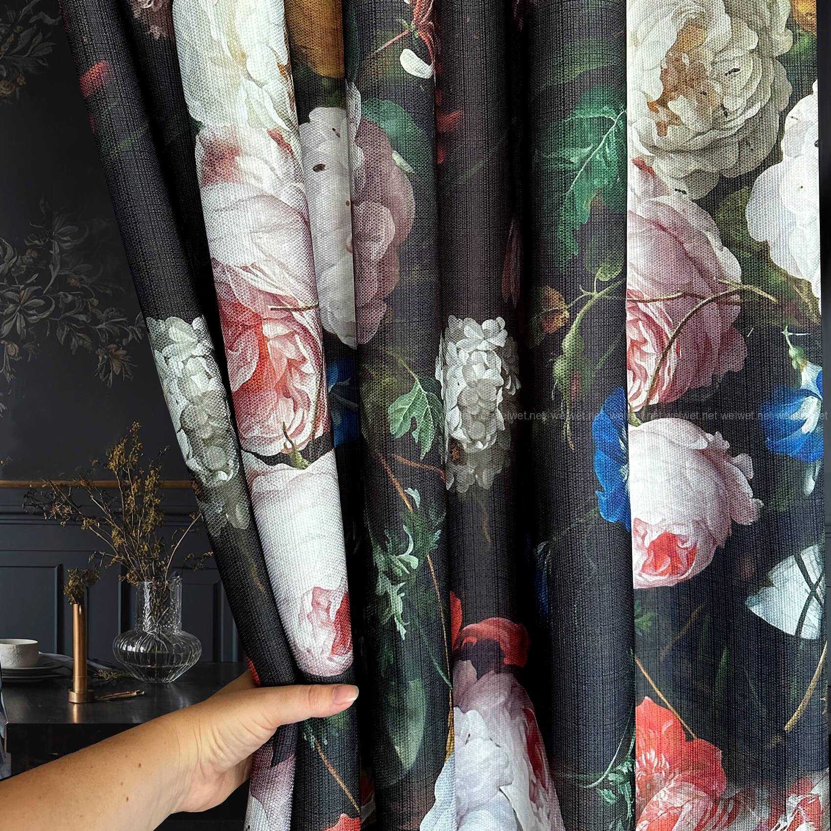 Комплект штор с текстурой льна с рисунком цветочных натюрмортов в голландском стиле.
