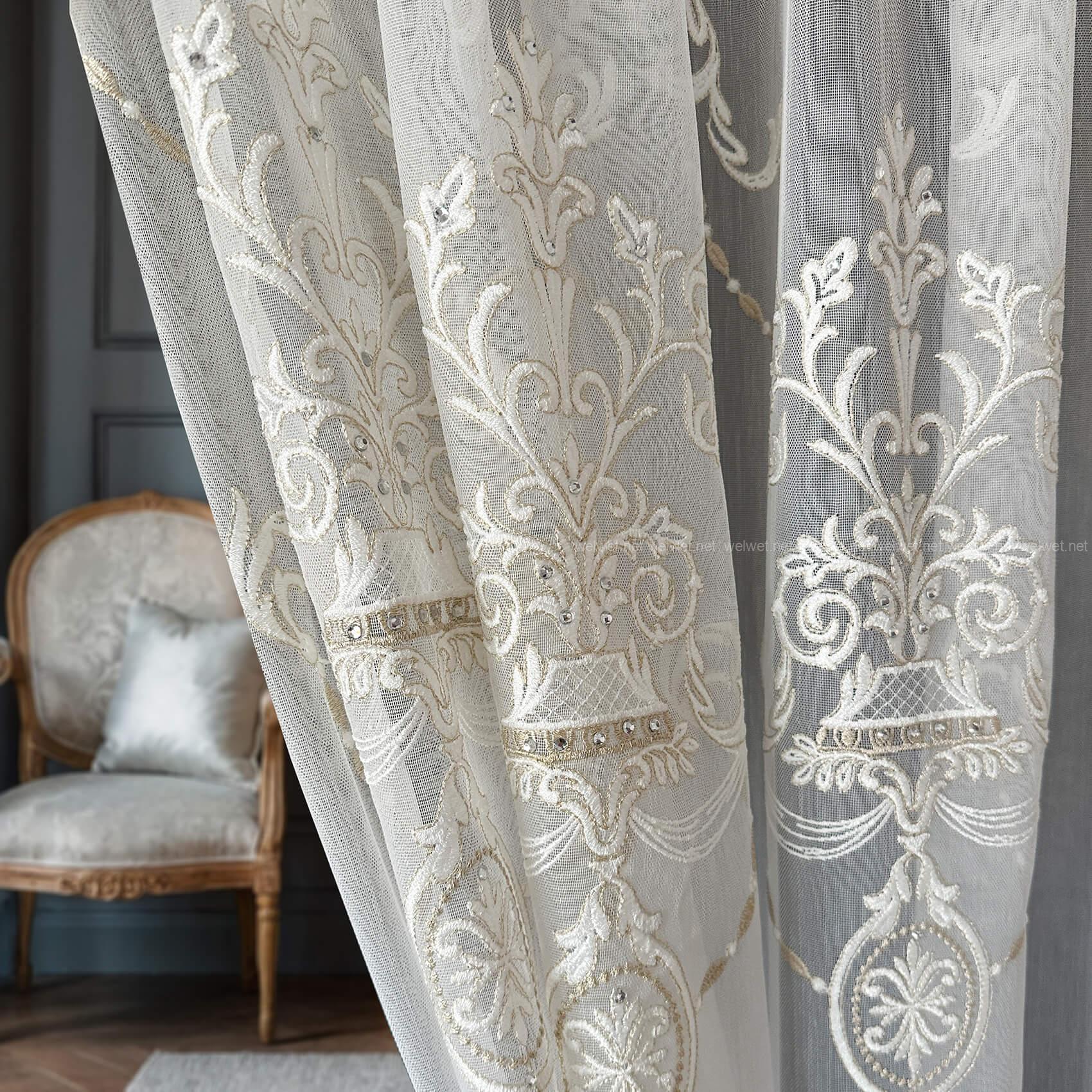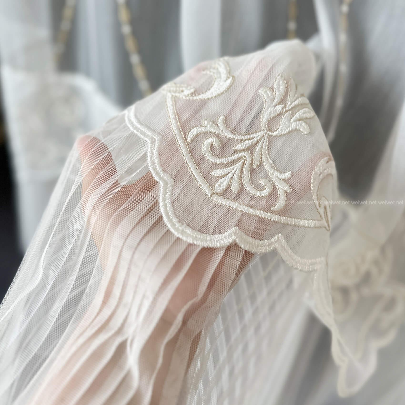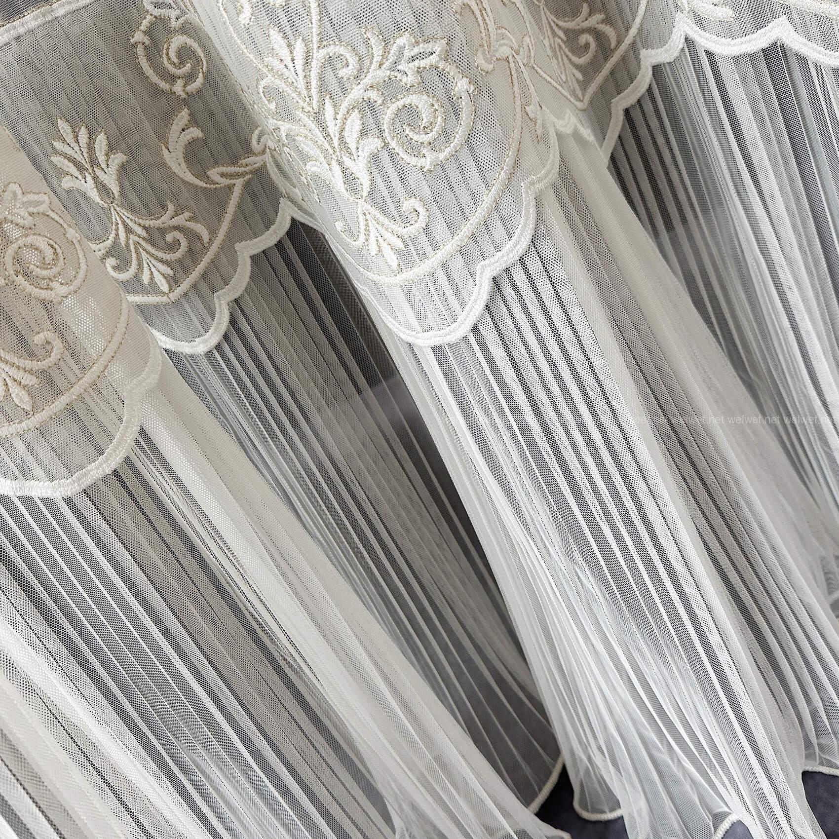 Ткань премиум качества турецкого производства в молочном цвете с вышивкой в неоклассическом стиле с плиссе и инкрустацией.