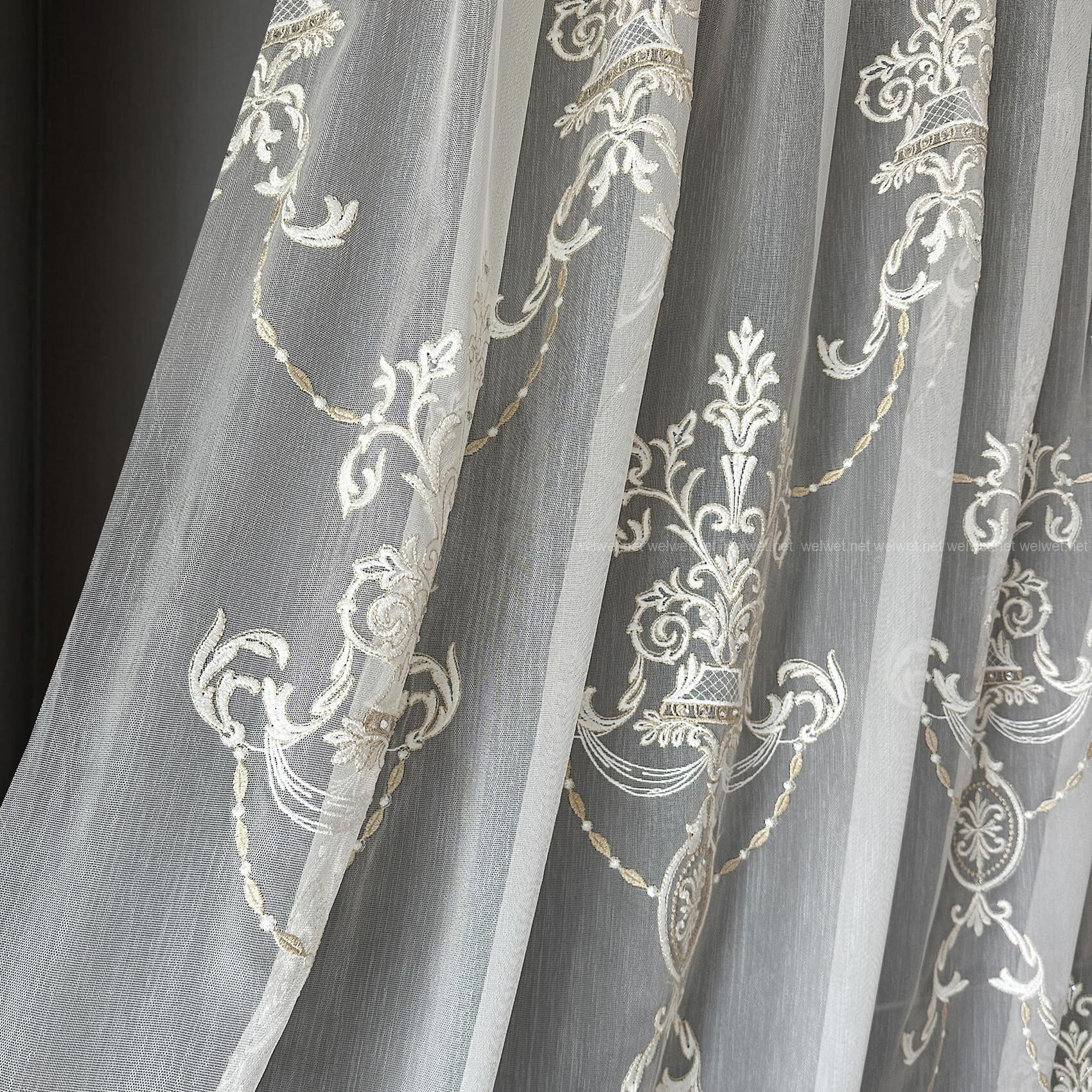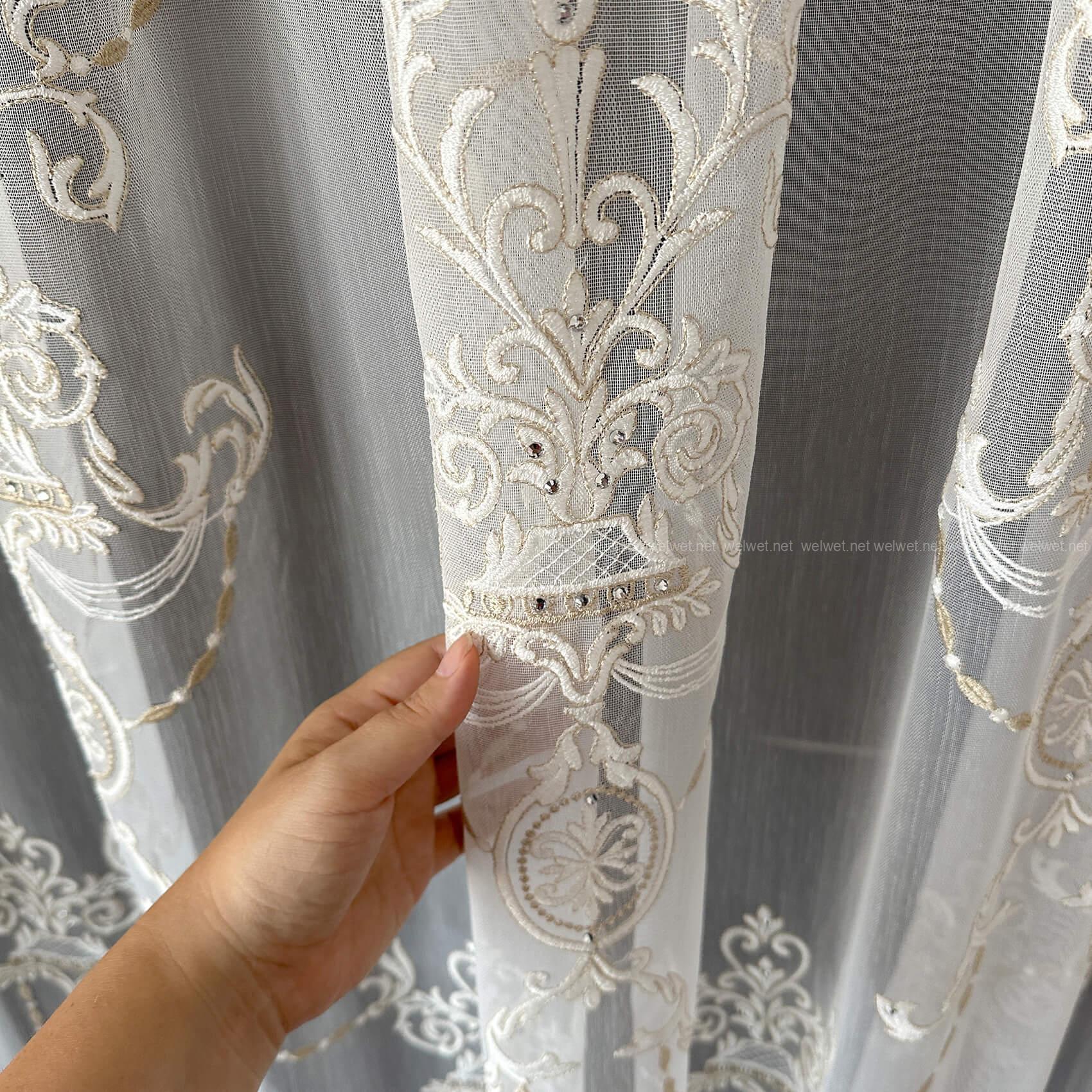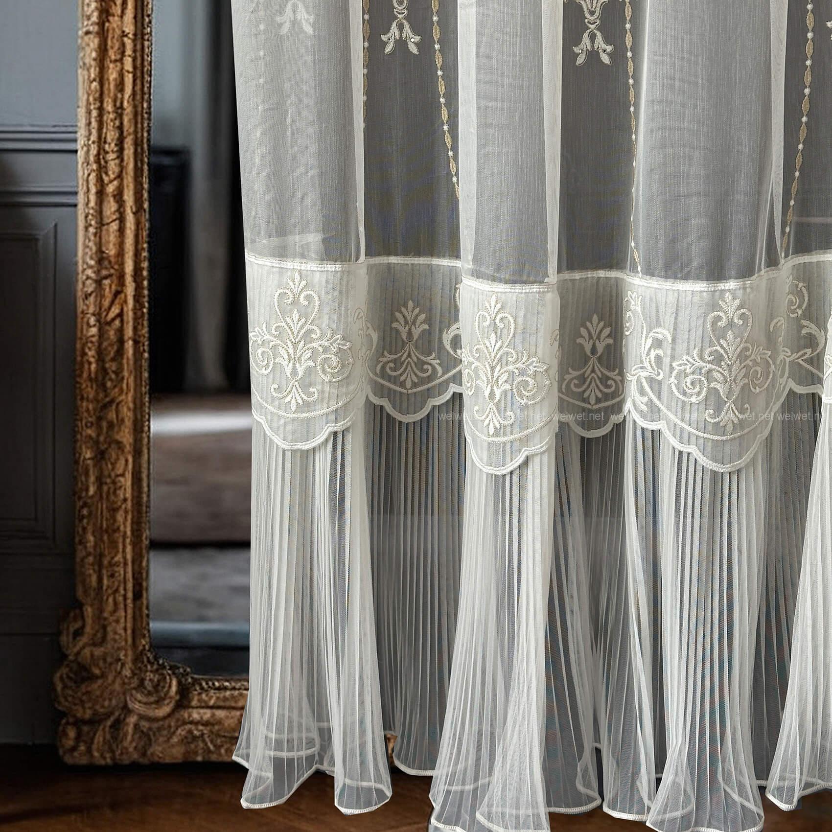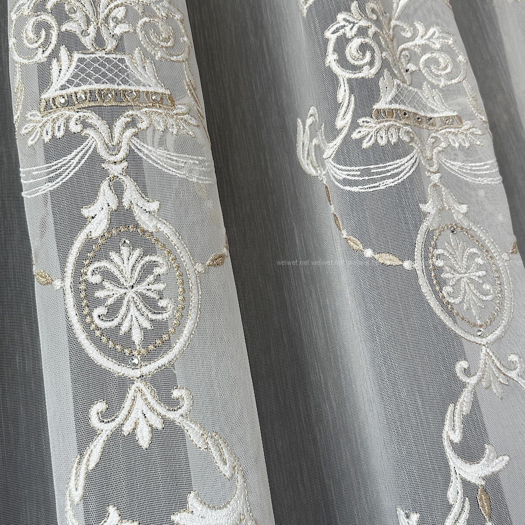 Ткань премиум качества турецкого производства в молочном цвете с вышивкой в неоклассическом стиле с плиссе и инкрустацией.